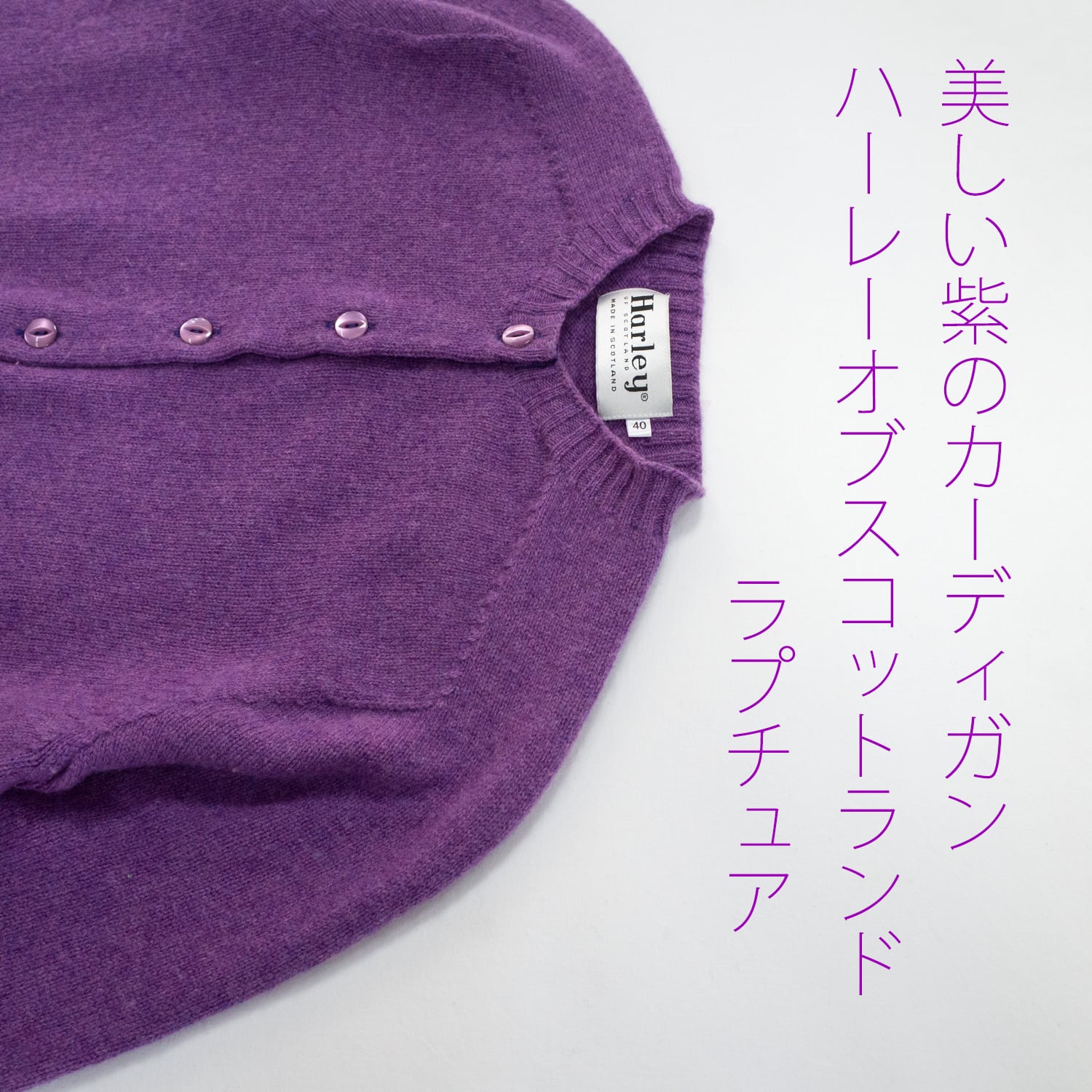 ラプチュアは紫系の美しいメランジです。 グログランテープ仕立ての前たて 糸と同色に染め上げられた蝶貝キャッツアイボタン クラシカルなデザインと美しい色がとても素敵です。 背中に一カ所だけ小さな虫喰いがありリペアしました、 編み目が縦方向一目に約1センチほど少し乱れていますが 目立たず着用には全く問題がございません。 カーディガンはフワフワと弾力があり繊維は生きています。 スーパーファインラムズウールはとても柔らかい肌触りと軽い着心地 一般的なラムズウールとは別次元の上質さです。 ハーレーオブスコットランドは 高等ニット技術を駆使したシームレスサドルショルダーです。 サドルショルダーはラグランスリーブの変形で 大きな運動量の 腕が自由に動く快適な袖です。 ハーレーオブスコットランドは シームレスニットウェア 軽くスムースでより快適な着心地です。