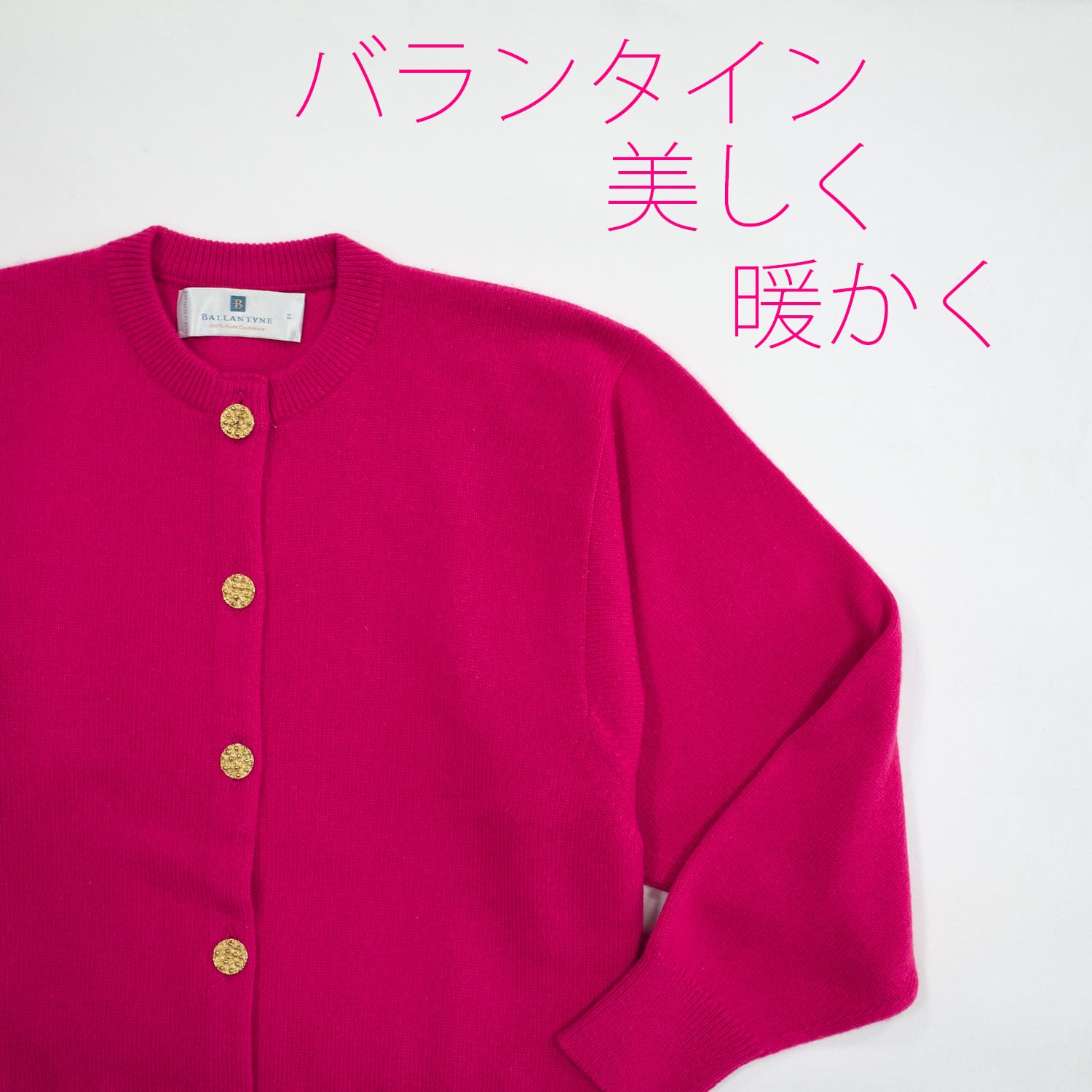 華やかなお色は気持を明るくさせ憂うつが吹っ飛びます。 クラシカルなデザインですが着こなしはご自由です。 クリロンはバランタインカシミヤのアイコン的カーディガン、美しい金ボタンとどっしりとした目付きの良い2プライカシミヤ、カーマインローズはコントラストの高い素晴らしい発色です。 ハイエンド・ホワイトカシミヤを精緻に編んだ 素晴らしいカシミヤニットウェアです。 現在ではこれほど素晴らしいカシミヤニットウェアは入手困難でしょう。 高価ですが、価値は十分にあります。 バランタイン本来の素晴らしさを味わっていただける逸品です 着用が1〜2回の極上ユーズドです。 The vibrant colors will brighten your mood and blow away any blues. The classic design is open to styling. The Clirron is Ballantine Cashmere's iconic cardigan, featuring beautiful gold buttons and a rich, well-woven two-ply cashmere, while the Carmine Rose offers stunning high-contrast color. This is a stunning cashmere knitwear piece, meticulously knitted from high-end white cashmere. It's rare to find such exquisite cashmere knitwear these days. It's expensive, but well worth it. A masterpiece that allows you to experience the true splendor of Ballantine's. It's in excellent pre-owned condition, having been worn once or twice.